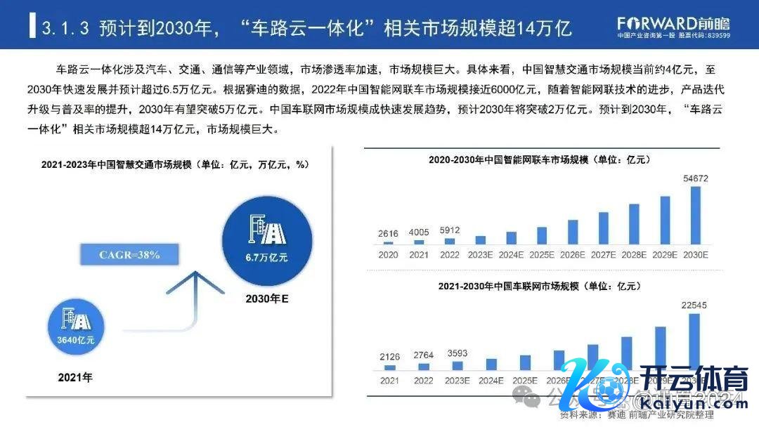 按国度战术鼓励,瞻望到 2026 年 “车路云一体化” 将消除 50 座主要城市、20 家主要车企以及国度概括立体交通网主骨架高速公路,催生万亿级广宽市集。到 2030 年中国车路云集中市集超 14 万亿,其中基础步伐市集限制达 6.7 万亿,运营职业市集限制为 2.25 万亿,智能网联车辆及运营市集限制达 5.47 万亿。永远来看,车路云数据运营职业市集空间瞻望超 10 万亿,以中国存量车 4.4 - 5 亿台揣测,淌若一齐接入车路云集中,每台车每年职业费 100 元,共计 500 亿元;每台车每年 1000 元等于 5000 亿元,20 年共计10 万亿元,30 年共计 15 万亿元。